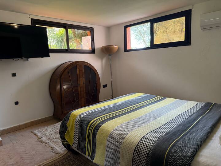 Nichée dans une villa au charme artistique unique, votre chambre vous donne accès à de vastes espaces de vie climatisés, un jardin privatif luxuriant, plusieurs terrasses dédiées à la détente, ainsi qu’une piscine de 25 mètres, idéale pour la nage comme pour un moment de relaxation. L’accès direct au golf d’Amelkis est facilité grâce à une voiturette mise à votre disposition.